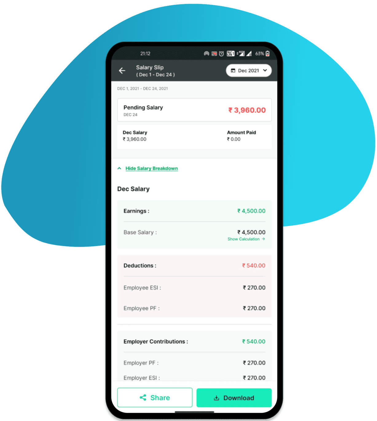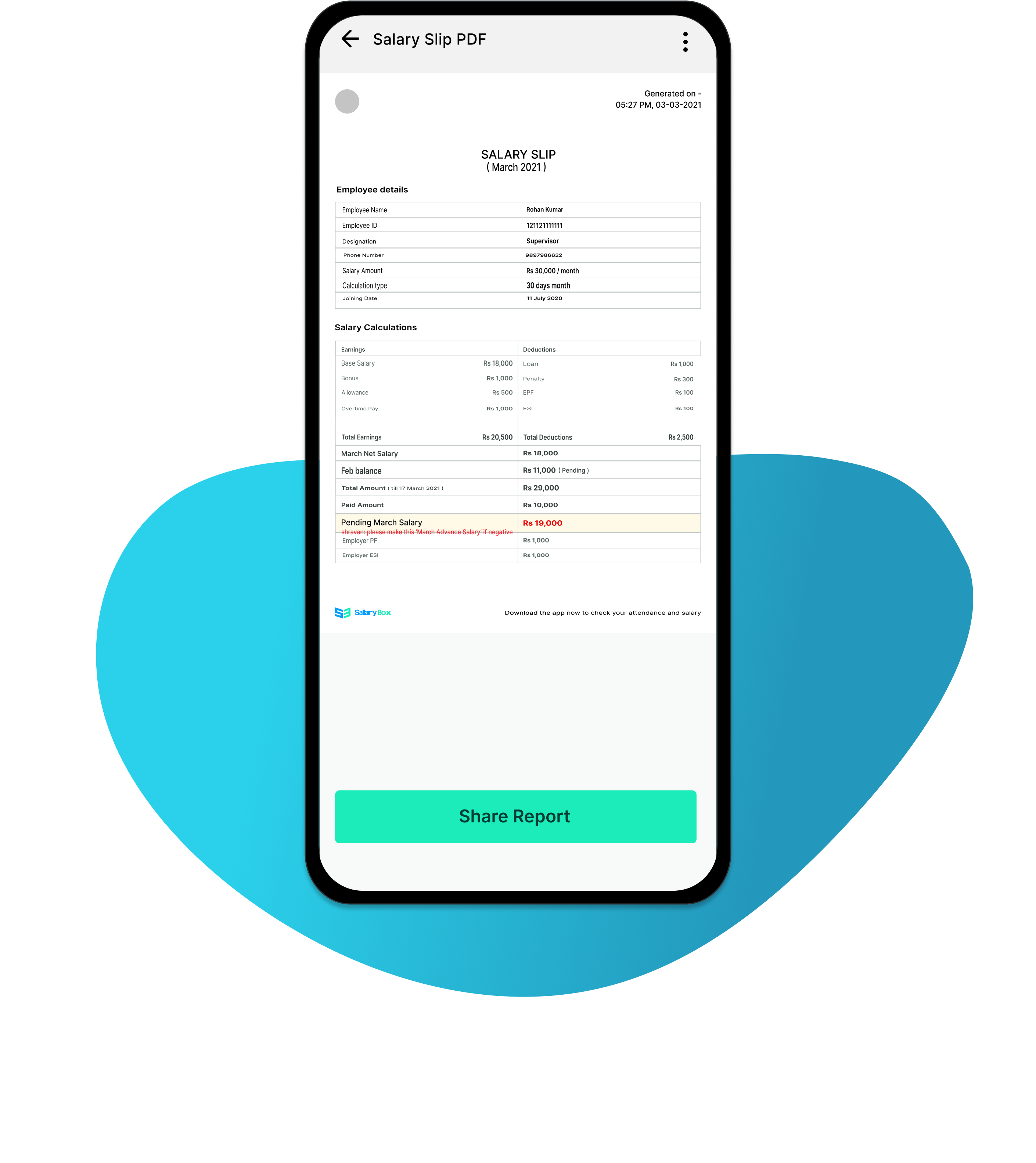 SalaryBox integrates every aspect of time tracking right from capturing time anywhere, scheduling shifts, and tracking over-time which is fully integrated with payroll. Avoid upfront costs and maintenance of custom hardware for attendance.